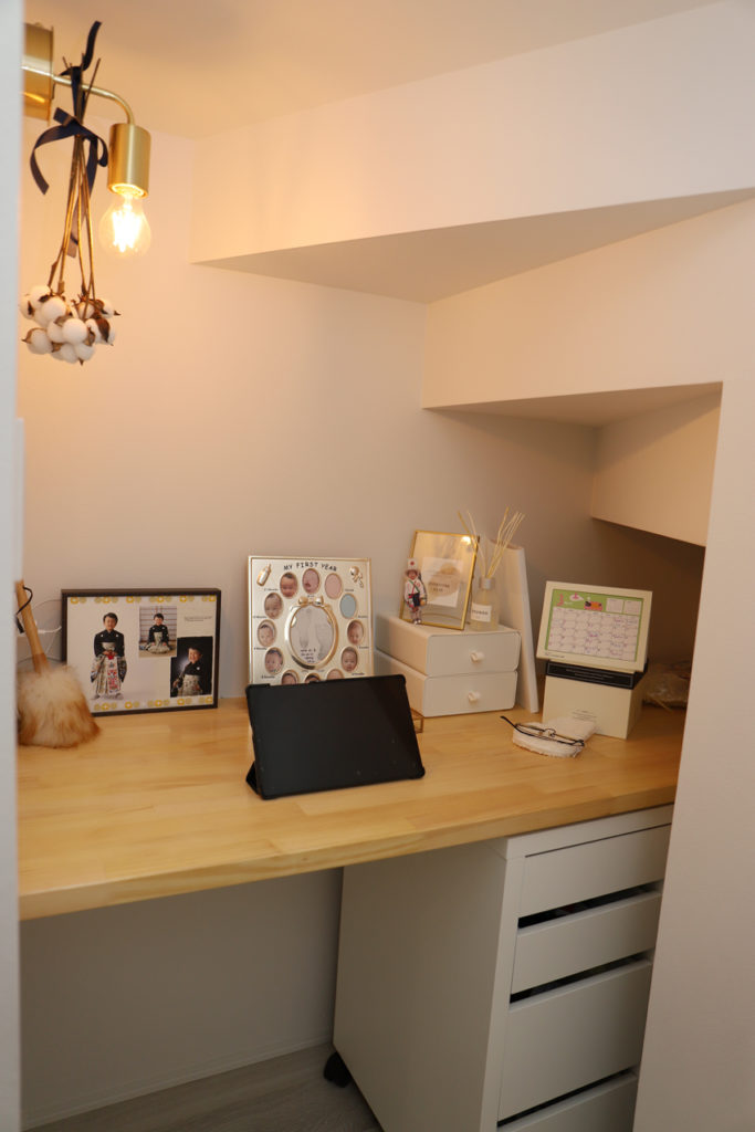 階段下のスペースを有効活用し、ちょっとした書斎に。こもり部屋としても落ち着く空間でお気に入りの場所に。
