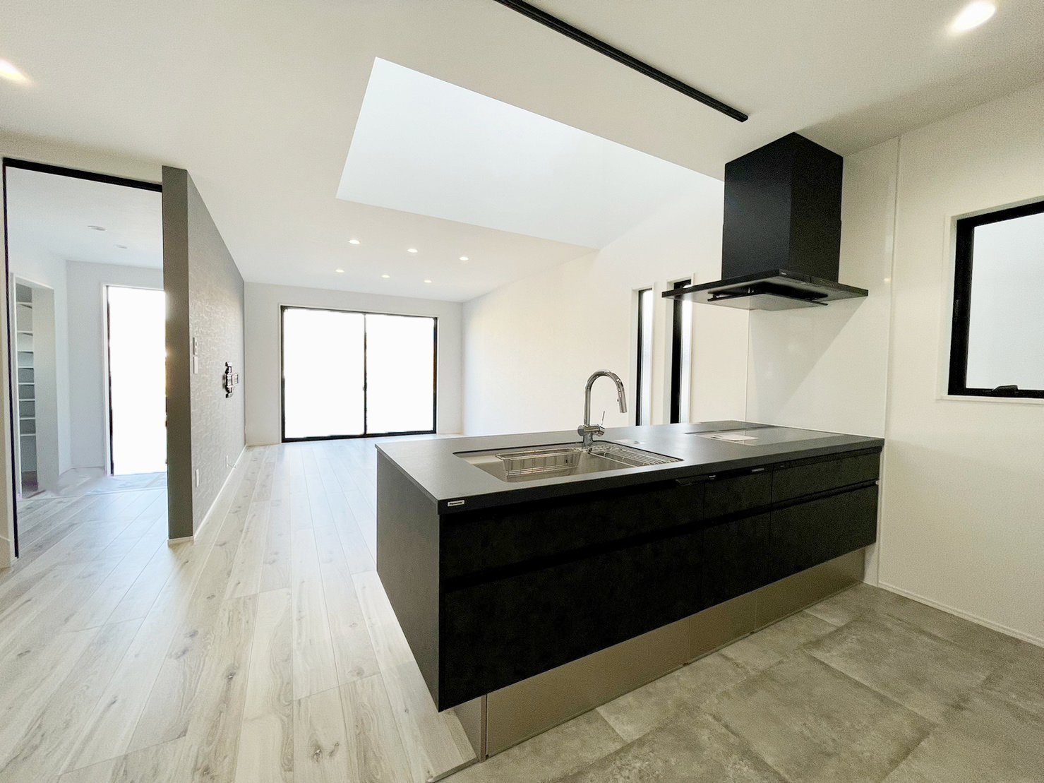 キッチンとリビングの間にある吹き抜けから光が差し込み、明るい空間です。