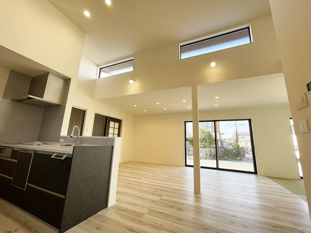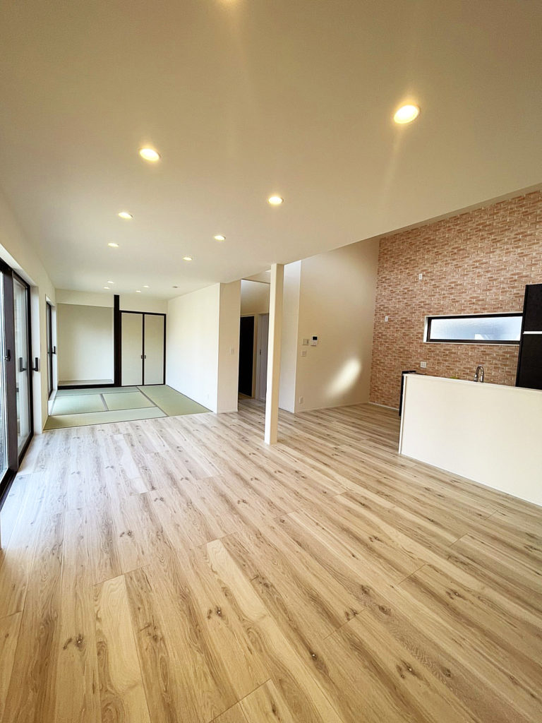 リビングとの続き間にある和室は扉を省き、奥行きのある高さを抑えた空間に。