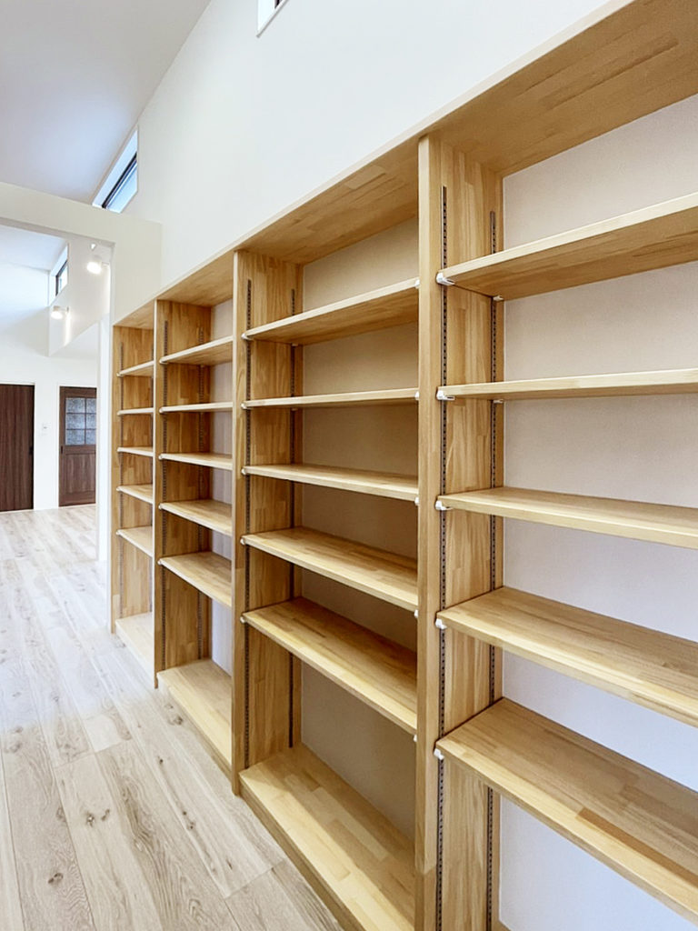 廊下の壁に大容量の造り付け収納棚を設けて、