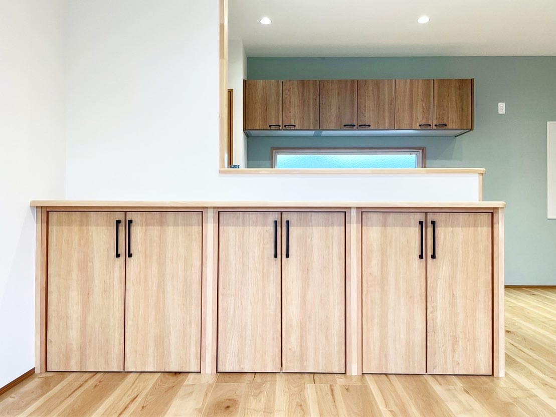 リビング側のカウンターの下を扉付きの収納を設けて、すっきりと見せます。